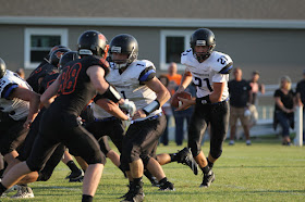 Above -  It’s a quarterback keeper from Spencer Pribyl (#21) who looks to follow the block of #1 Colton Bossaller.
